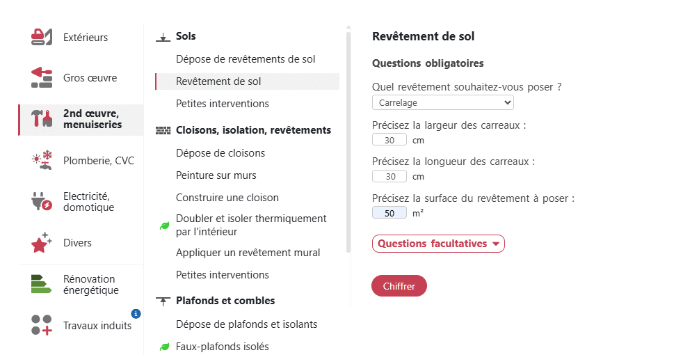 Sur le logiciel vous pouvez retrouvez les travaux suivants : dépose et revêtement de sol, revêtement de sol, petites interventions, mise à niveau, drainage et étanchéité sous carrelage, isolation des sols…
