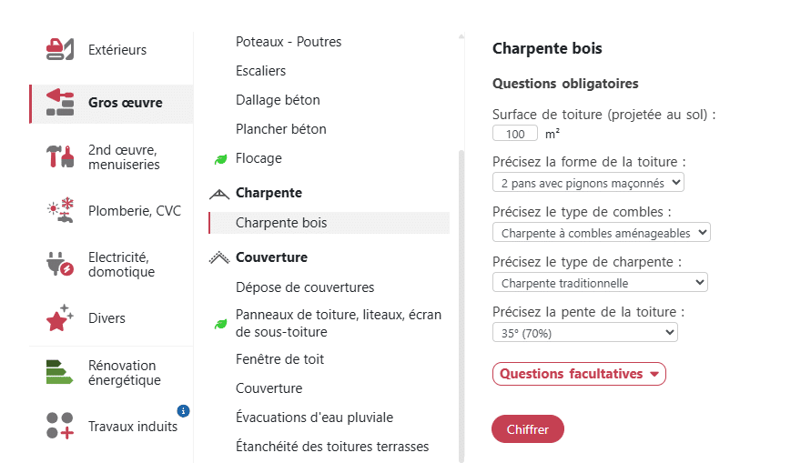 - Chiffrez vos travaux : charpente bois, fermette, tuiles, ardoises, bacs acier, étanchéité, lucarnes, noues, faîtages, etc.