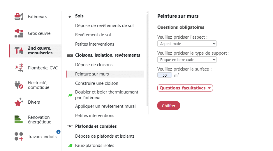 - Chiffrez tous types de prestations : ratissage, enduit, peinture intérieure ou extérieure, laques, vernis, pose de toile de verre, peinture technique, etc.